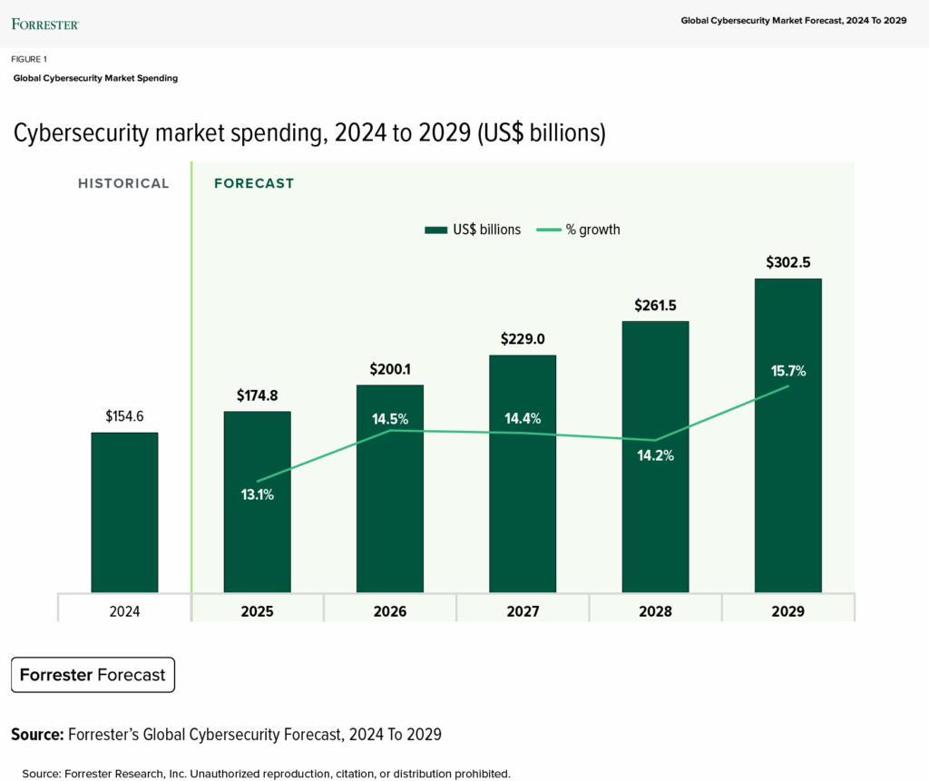 Despite the ongoing macroeconomic uncertainty in 2025 fueled in part by sudden changes in US trade policy and tariffs, demand for cybersecurity products and services will remain a tech-spending bright spot, projected to grow faster than overall global commercial software. According to Forrester’s Global Cybersecurity Market Forecast, 2024-2029, cybersecurity spending will rise by 13.1% in 2025 to $174.8 billion, driven by ongoing concerns around cyberattacks and coupled with organizations’ need to secure new cloud-based deployments and other emerging technologies such as genAI.